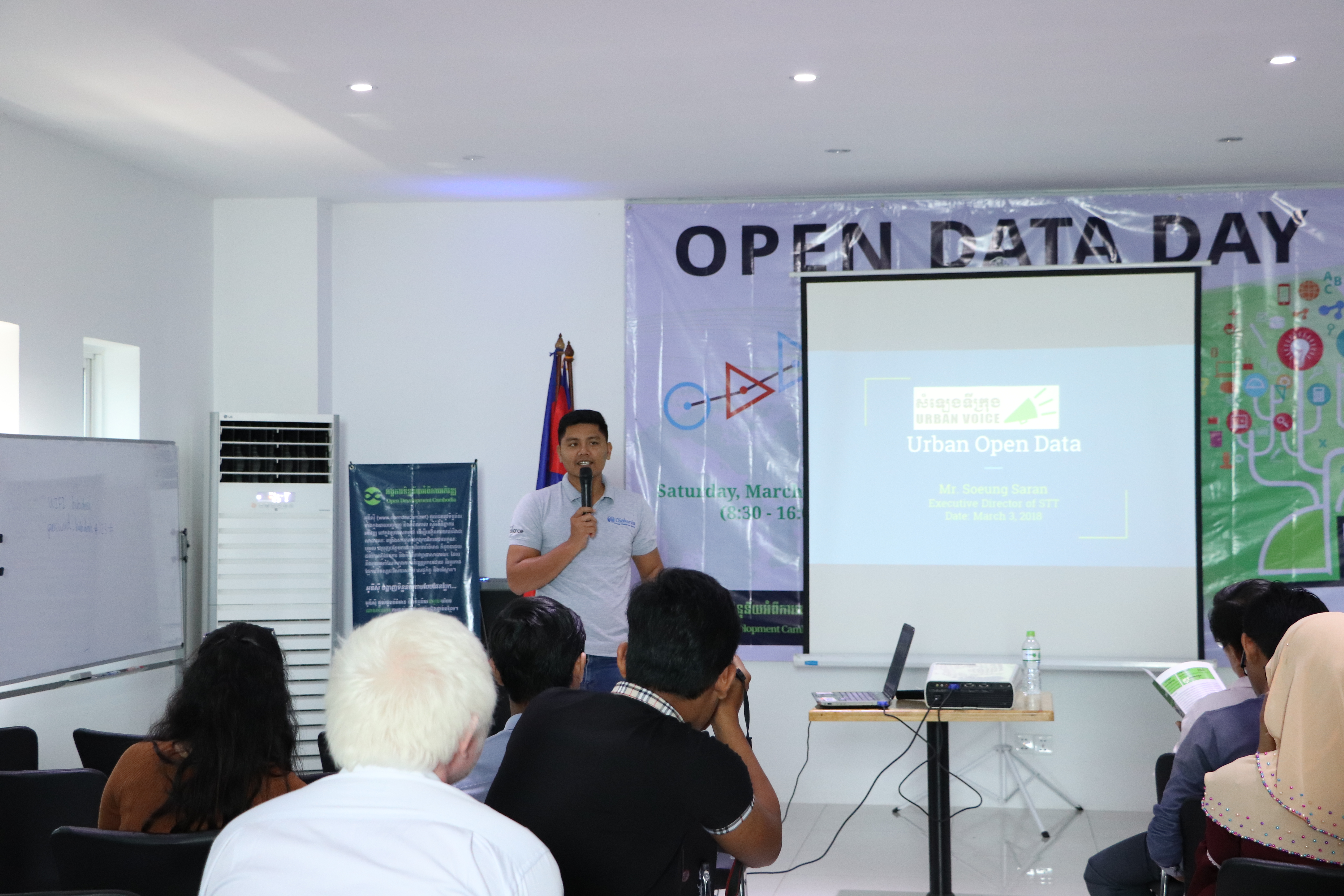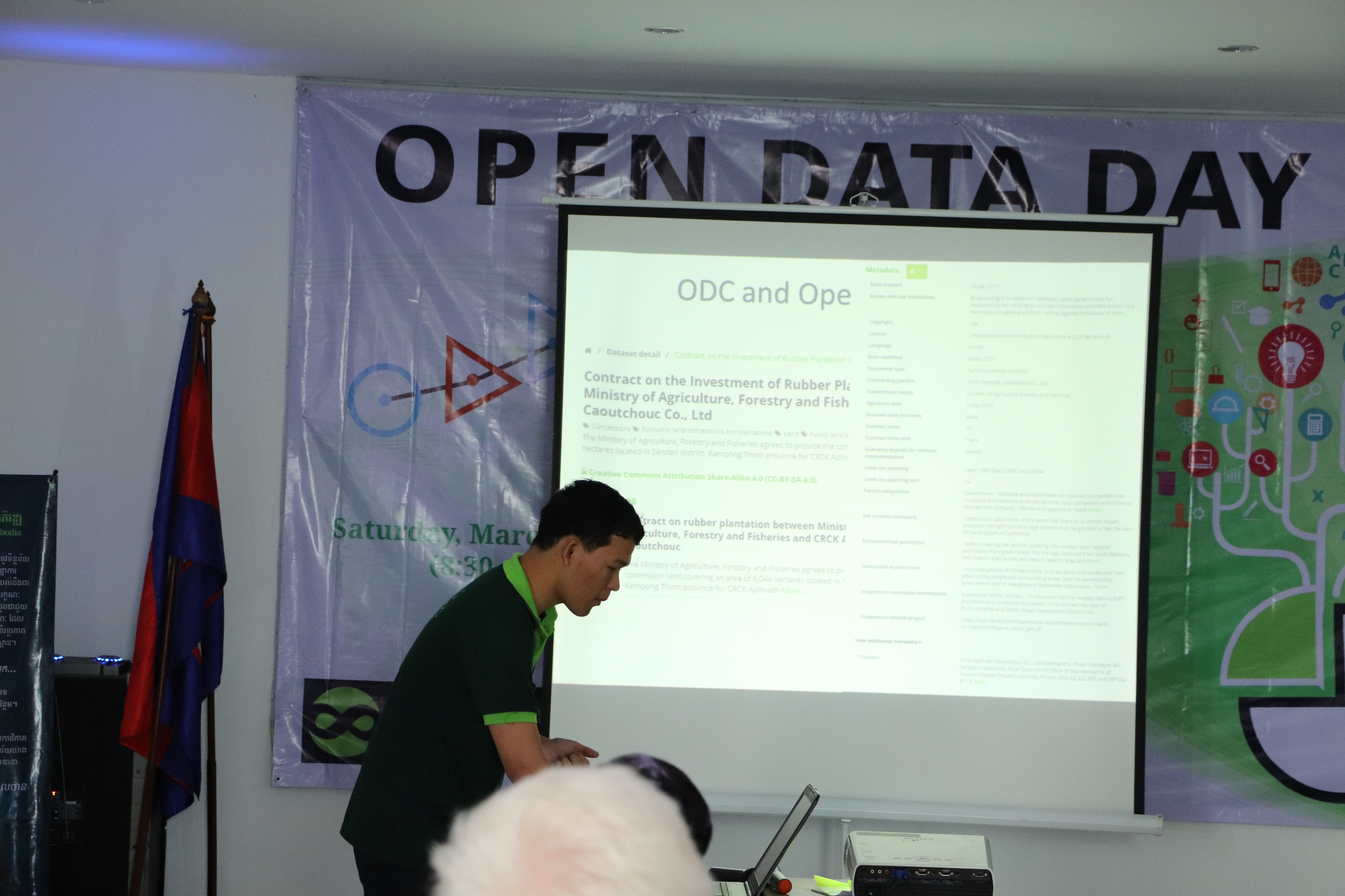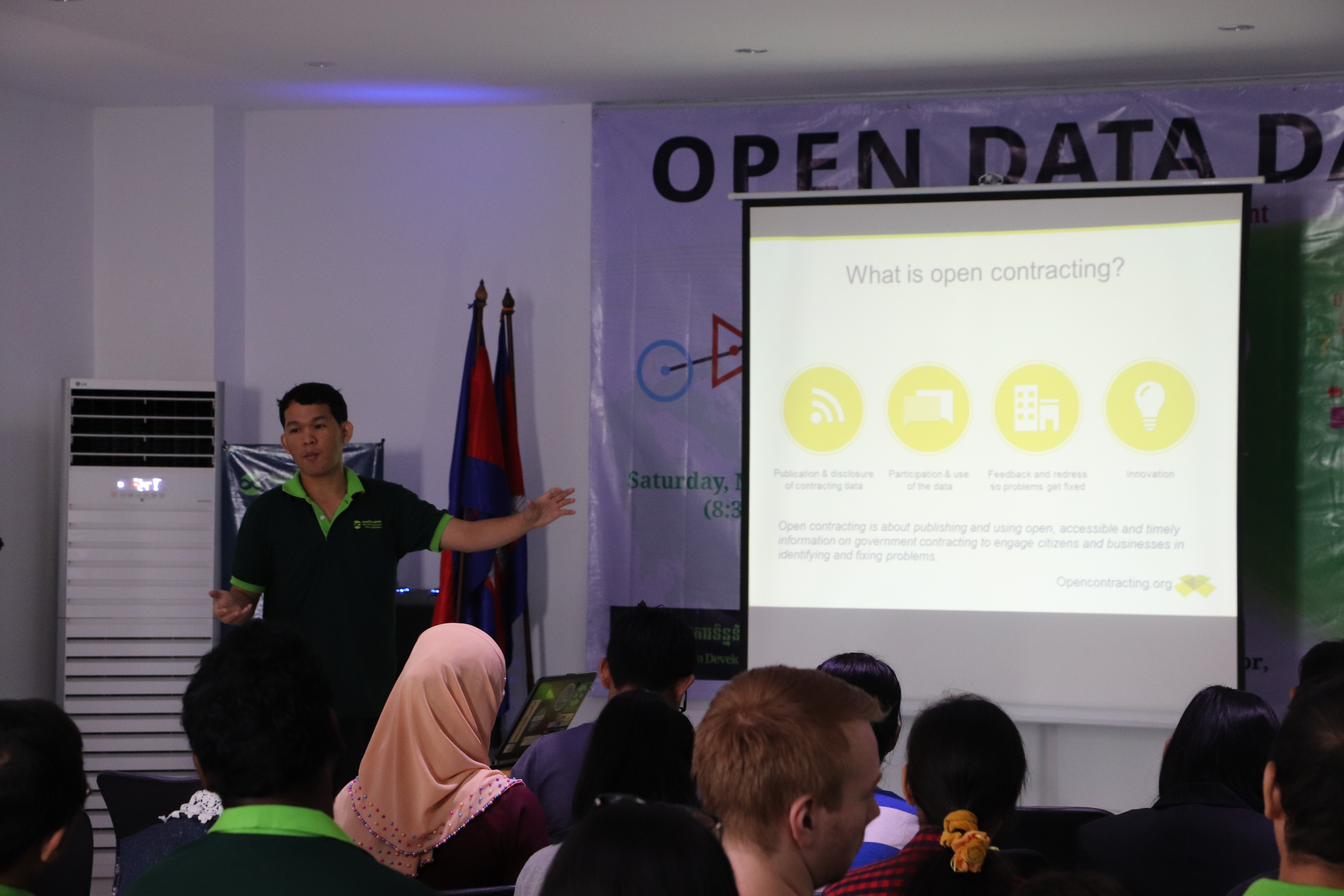 “ទិវាទិន្នន័យបើកទូលាយ ២០១៨” នៅភ្នំពេញ ចាប់ផ្តើមដោយការណែនាំដោយលោក ធី ទ្រី នាយកប្រតិបត្តិ/និពន្ធនាយក នៃអង្គការទិន្នន័យអំពីការអភិវឌ្ឍ និងលោកស្រី ថើរី ផាណេល ស្ថាបនិករបស់អង្គការ អូឌីស៊ី។ លោក ព្រំ ពន់វឌ្ឍន៍ អ្នកស្រាវជ្រាវទិន្នន័យ និងមន្ត្រីផ្នែក GIS បានបន្តការធ្វើបទបង្ហាញអំពី កិច្ចសន្យាបើកទូលាយ ដែលជាប្រធានបទគោលសម្រាប់ទិវាទិន្នន័យបើកទូលាយនៅរាជធានីភ្នំពេញឆ្នាំនេះ។