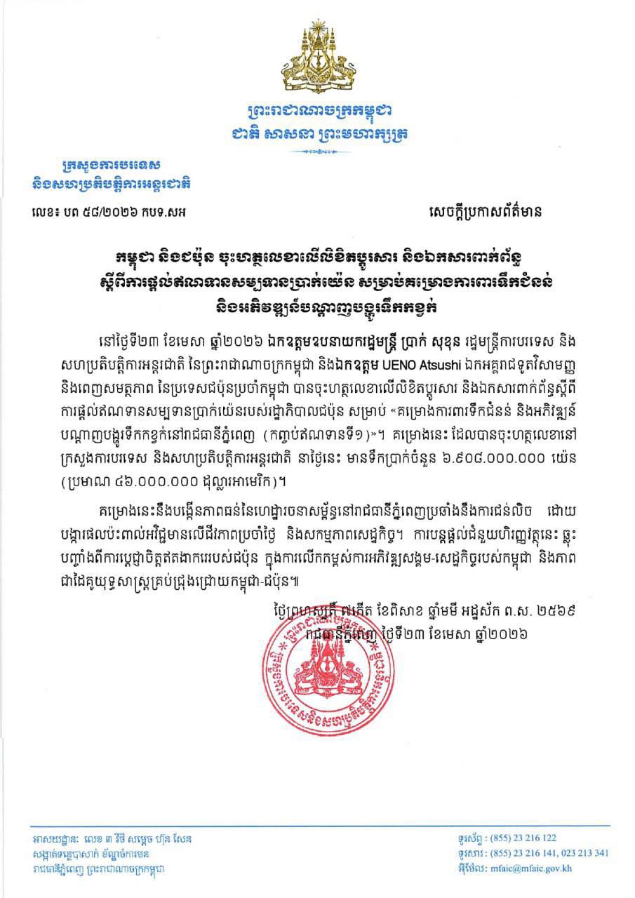 នៅថ្ងៃទី១៩ ខែមេសា ឆ្នាំ២០២៦ ក្រសួងការបរទេស និងសហប្រតិបត្តិការអន្តរជាតិ បានចេញសេចក្ដីប្រកាសព័ត៌មានស្តីពីការតវ៉ាជាផ្លូវការរបស់រាជរដ្ឋាភិបាលកម្ពុជាប្រឆាំងនឹងសកម្មភាពរបស់កងកម្លាំងប្រដាប់អាវុធថៃ។ក្រសួងការបរទេស និងសហប្រតិបត្តិការអន្តរជាតិ នៃព្រះរាជាណាចក្រកម្ពុជា សូមសម្តែងនូវការតវ៉ាជាផ្លូវការរបស់ ...