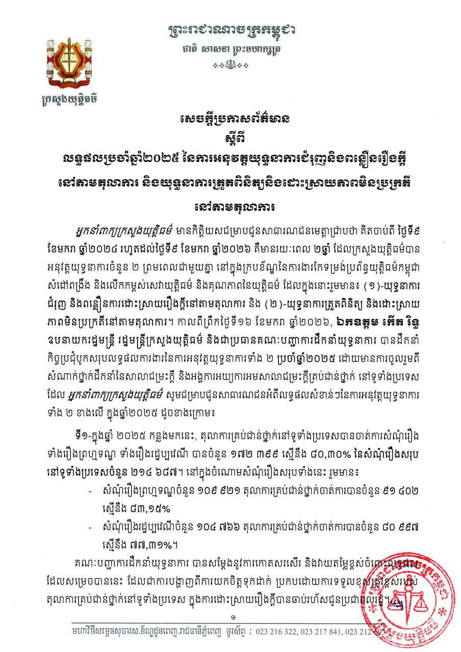 នៅថ្ងៃទី១៦ ខែមករា ឆ្នាំ២០២៦ ក្រសួងយុត្តិធម៌ បានចេញសេចក្ដីប្រកាសព័ត៌មាន ស្ដីពី លទ្ធផលប្រចាំឆ្នាំ២០២៥នៃការអនុវត្តយុទ្ធនាការជំរុញនិងពន្លឿនរឿងក្តីនៅតាមតុលាការ និងយុទ្ធនាការត្រួតពិនិត្យនិងដោះស្រាយភាពមិនប្រក្រតីនៅតាមតុលាការ។ការអនុវត្តយុទ្ធនាការជំរុញនិងពន្លឿនរឿងក្តីនៅតាមតុលាការ និងយុទ្ធនាការត្រួតពិនិត្យនិងដោះស្រាយភាពមិនប្រក្រតីនៅតាមតុលាការ ទទួលបានលទ្ធផលប្រចាំឆ្នាំ២០២៥ដូចមានក្នុងឯកសារភ្ជាប់។ ...