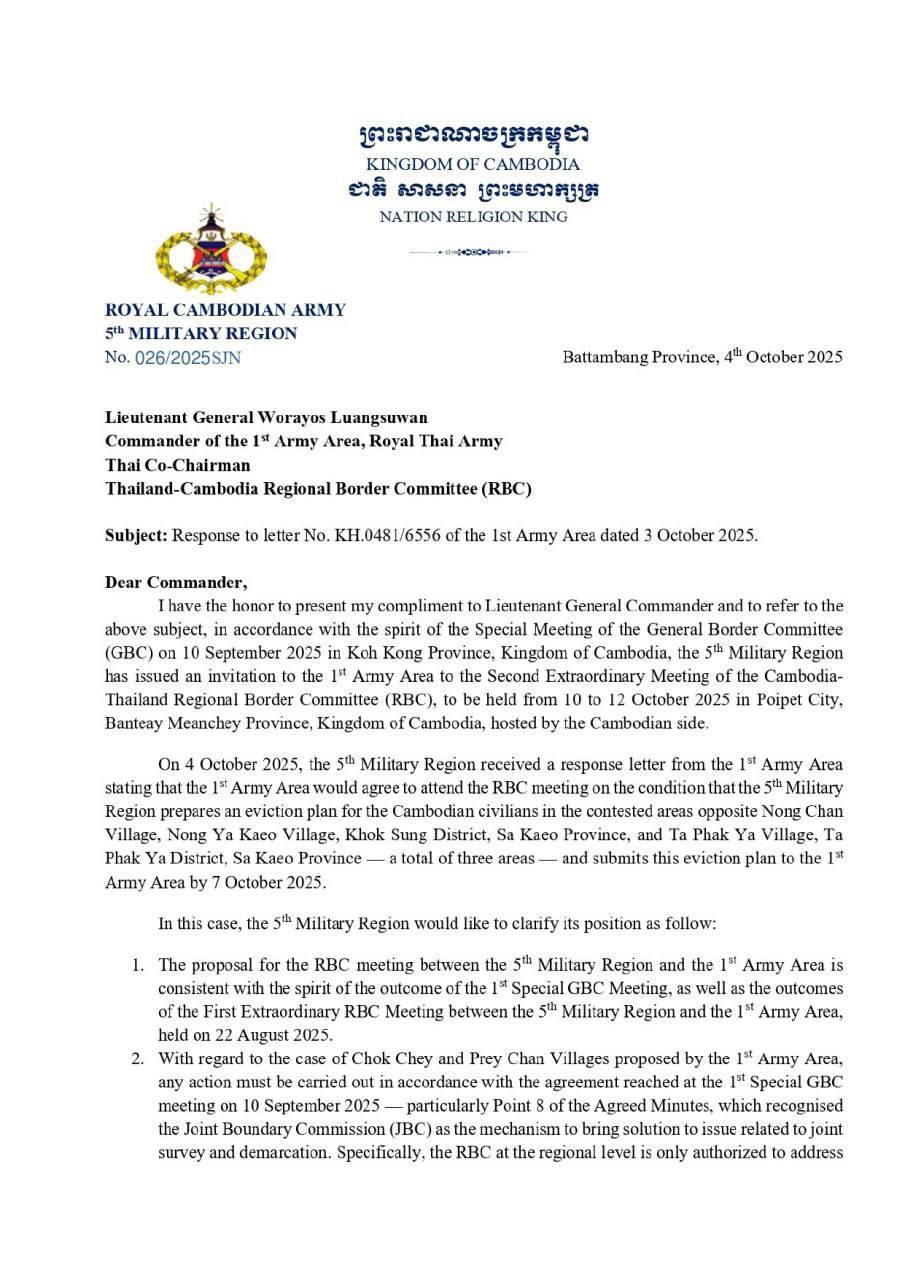 ​លិខិត​ពី​យោធា​ភូមិភាគ​ទី​៥​ នៃ​កង​យោធពលខេមរភូមិន្ទ​ ចុះ​ថ្ងៃ​ទី​៤​ ខែតុលា​ ឆ្នាំ​២០២៥​ ជូន​ចំពោះ​មេបញ្ជាការ​កងទ័ព​ភូមិភាគ​ទី​១​ នៃ​កងទ័ព​ភូមិន្ទ​ថៃ​ ឆ្លើយ​តប​លក្ខខណ្ឌ​របស់​ភាគី​ថៃ​ដែល​បាន​លើក​ឡើង​សម្រាប់​ការ​ចូលរួម​កិច្ចប្រជុំ​ពិសេស​លើក​ទី ...