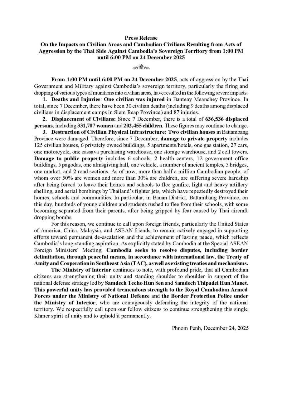 • Cambodian Minister of Environment Eang Sophalleth has described Thailand’s aggressive incursions into Cambodian territory through aerial bombardment, artillery shelling and the use of toxic smoke as violations of international law that have destroyed natural resources, actions that should be considered “environmental crime”. ...
