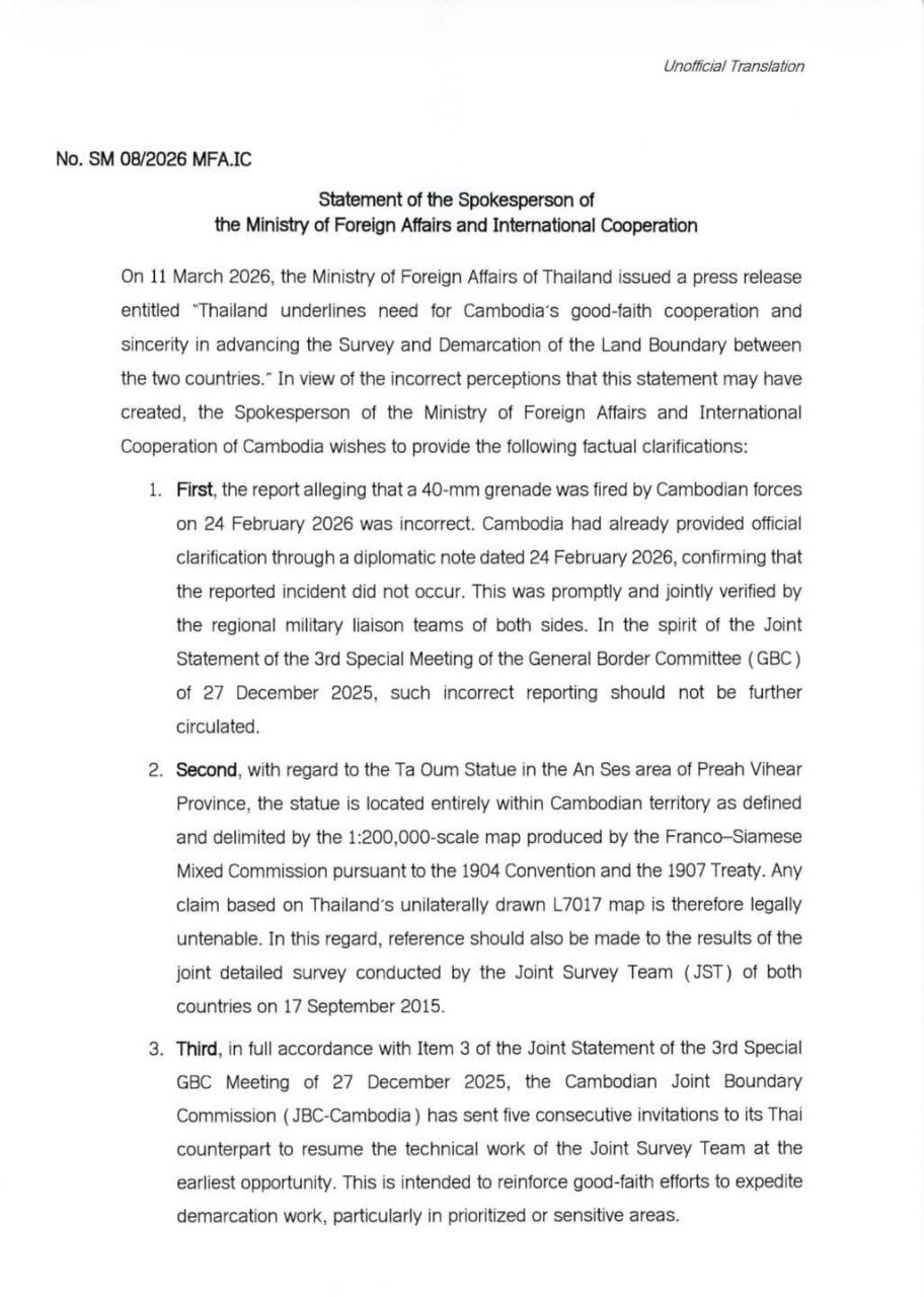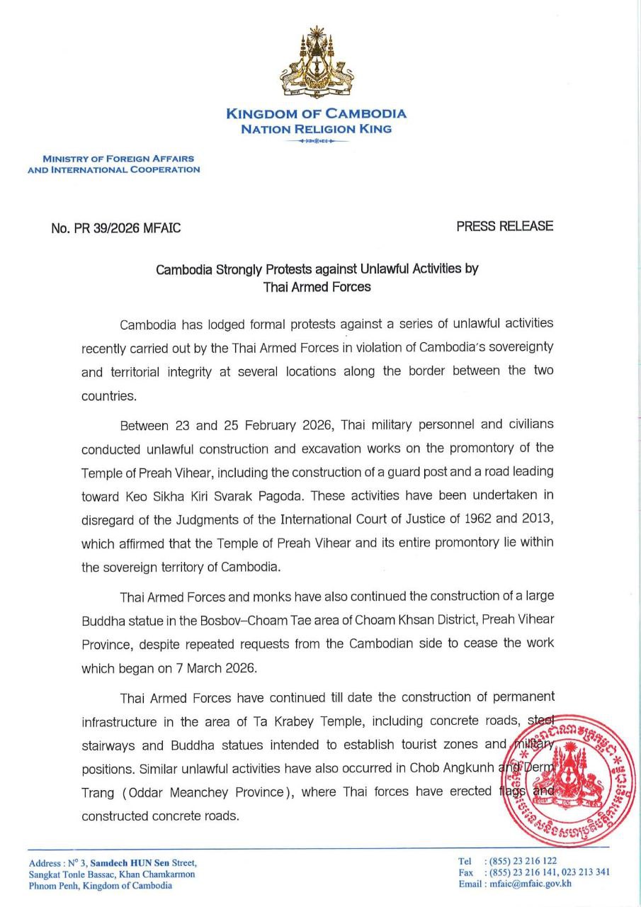 On 11 February 2026, the Ministry of Foreign Affairs and International Cooperation issued a press release on Cambodia’s protest against unlawful activities undertaken by the Thai armed forces.The Ministry of Foreign Affairs and International Cooperation of Cambodia has strongly protested against further unlawful activities undertaken ...