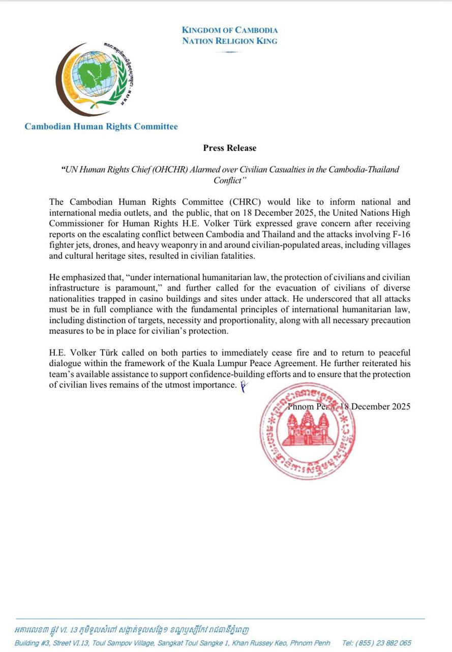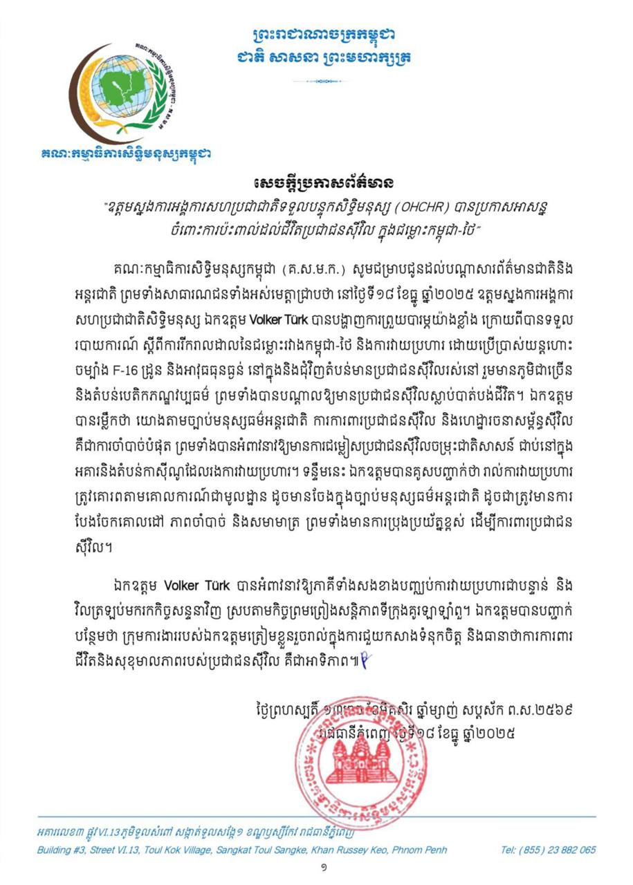 នៅថ្ងៃទី១៨ ខែធ្នូ ឆ្នាំ២០២៥ គណៈកម្មាធិការសិទ្ធិមនុស្សកម្ពុជា បានចេញសេចក្ដីប្រកាសព័ត៌មាន ស្ដីពី ឧត្តមស្នងការអង្គការសហប្រជាជាតិទទួលបន្ទុកសិទ្ធិមនុស្ស (OHCHR) ប្រកាសអាសន្នចំពោះការប៉ះពាល់ដល់ជីវិតប្រជាជនស៊ីវិលក្នុងជម្លោះកម្ពុជា-ថៃ។ឧត្តមស្នងការអង្គការ សហប្រជាជាតិសិទ្ធិមនុស្ស ឯកឧត្តម Volker Türk បានបង្ហាញការព្រួយបារម្ភយ៉ាងខ្លាំង ក្រោយពីបានទទួលរបាយការណ៍ ស្តីពីការរីករាលដាលនៃជម្លោះរវាងកម្ពុជា-ថៃ និងការវាយប្រហារដោយប្រើប្រាស់យន្តហោះចម្បាំង F-16 ដូ្រន និងអាវុធធុនធ្ងន់នៅក្នុង និងជុំវិញតំបន់មានប្រជាជនស៊ីវិលរស់នៅ រួមមានភូមិជាច្រើននិងតំបន់បេតិកភណ្ឌវប្បធម៌ ព្រមទាំងបានបណ្តាលឱ្យមានប្រជាជនស៊ីវិលស្លាប់បាត់បង់ជីវិត។ ...