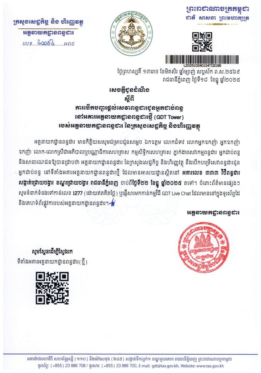 នៅថ្ងៃទី១៨ ខែធ្នូ ឆ្នាំ២០២៥ អគ្គនាយកដ្ឋានពន្ធដារ នៃក្រសួងសេដ្ឋកិច្ច និងហិរញ្ញវត្ថុ បានចេញសេចក្តីជូនដំណឹងស្តីពីការចាប់ផ្តើមដាក់ឱ្យដំណើរការបញ្ជរផ្តល់សេវាពន្ធដារជូនអ្នកជាប់ពន្ធ នៅអគារអគ្គនាយកដ្ឋានពន្ធដារថ្មី (GDT Tower) ដែលមានទីតាំងស្ថិតនៅ អគារ ...