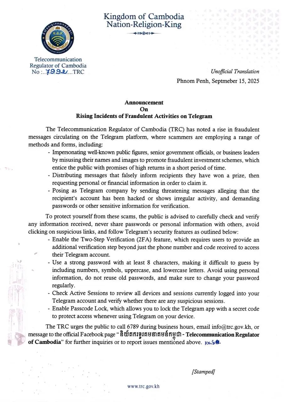 On 15 September 2025, the Telecommunication Regulator of Cambodia (TRC) issued an announcement on the rising incidents of fraudulent activities on Telegram.To protect yourself from these scams, the public is advised to carefully check and verify any information received, never share passwords or personal information ...