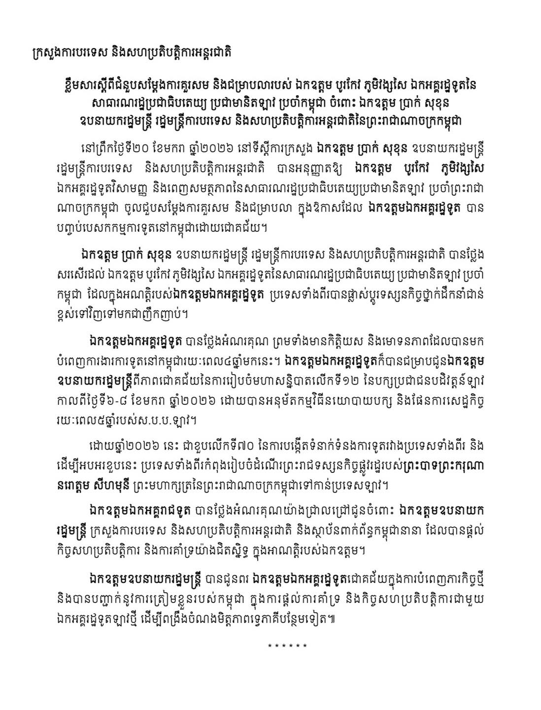 On 20 January 2026, the Ministry of Foreign Affairs and International Cooperation issued a readout on the farewell courtesy call of His Excellency Buakeo Phumvongsay, Ambassador of the Lao People’s Democratic Republic to Cambodia, to His Excellency PRAK Sokhonn, Deputy Prime Minister, Minister of Foreign ...