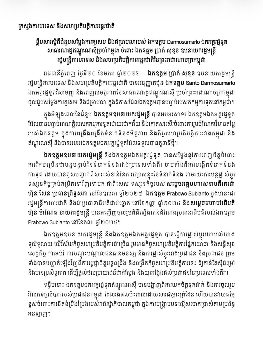 On 20 January 2026, the Ministry of Foreign Affairs and International Cooperation issued a readout on the farewell courtesy call of His Excellency Darmosumarto, Ambassador of Indonesia to Cambodia, to His Excellency PRAK Sokhonn, Deputy Prime Minister, Minister of Foreign Affairs and International Cooperation of ...